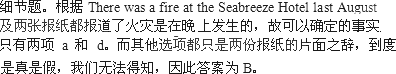 阅读理解 Beldon and Canfield are two seashore towns, not far apart.Both towns have many hotels, and in summer the hotels are full of holiday-makers and other tourists. Last August there was a fire at the Seabreeze Hotel in Beldon.The next day, this news appeared on page two of the town's newspaper.The Beldon Post: FIRE AT SEABREEZE Late last night firemen hurried to the Seabreeze Hotel and quickly put out a small fire in a bedroom.The hotel manager said that a cigarette started the fire.We say again to all our visitors:“Please don't smoke cigarettes in bed.” This was Beldon's first hotel fire for five years. The Canfield Times gave the news in these words on page one: ANOTHER BELDON HOTEL CATCHES FIRE Last night Beldon firemen arrived just too late to save clothing, bedclothes and some furniture at the Seabreeze Hotel.An angry holiday-maker said, “An electric lamp probably started the fire.The bedroom lamps are very old at some of these hotels.When I put my bedside light on, I heard a funny noise from the lamp.” We are glad to tell our readers that this sort of adventure does not happen in Canfield. What are the facts, then?It is never easy to find out the exact truth about an accident.There was a fire at the Seabreeze Hotel last August:that is one fact.Do we know anything else?Yes, we know that firemen went to the hotel. Now what do you think of the rest of the “news”? |