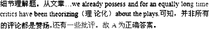 Shakespeare, more perhaps than any other writer, make full use of greatest resources of the English Language.Most of us use about five thousand words in our normal employment of English; Shakespeare in his works used about twenty-five thousand!There is probably no better way for a foreigner to appreciate the richness and variety of the English language than by studying the various ways in which Shakespeare uses it.Such a study is well worth the effort, even though some aspects of English usage ,and the meaning of many words ,have changed since Shakespeare's day. However ,it is surprising that we should know comparatively little about the life of the greatest English author.We know that Shakespeare was born in 1564 in Stratford-on-Avon ,and that he died there in 1616.He almost certainly attended the Grammer School in the town ,but of this we cannot be sure.We know he was married there in 1582 to Anne Hathaway and that he had three children.We know that he spent much of his life in London writing his masterpieces.But this is almost all that we do know. However ,what is important about Shakespeare's life is not its incidental details but its products , the plays and the poems.For many years scholars have been trying to add a few facts about Shakespeare's life to the small number we already possess and for an equally long tine critics(批评)have been theorizing(理论化)about the plays.Sometimes ,indeed ,it seems that the poetry of Shakespeare will disappear under the great mass of comment that has been written upon it. Fortunately this is not likely to happen.Shakespeare's people have long delighted not just the English but lovers of literature everywhere ,and will continue to do so after the scholars and critics and all their works have been forgotten. |