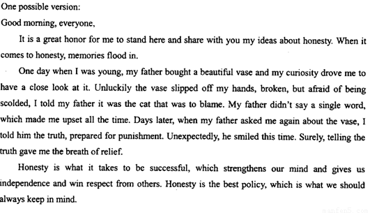 假如下周你校将组织一次以“Honesty”为主题的演讲比赛。请你结合生活中的一个事例以及你对honesty的理解,用英语准备一篇演讲稿。